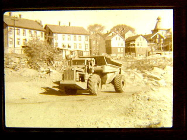 Flood of 1955 aftermath showing flood control work behind River Street.