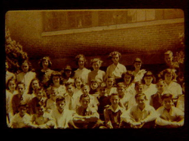 Holy Family School on South Main Street. Group of students posing outside of school.