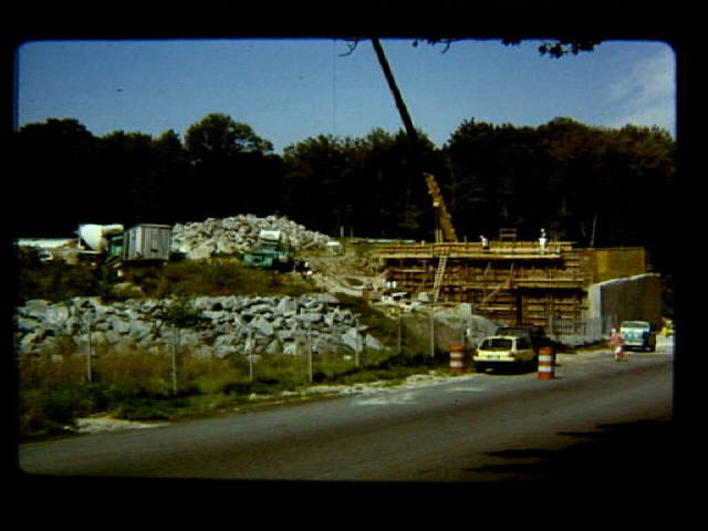 Distant view of construction of Woonsocket connector highway bridge abutments crossing Old River Road in