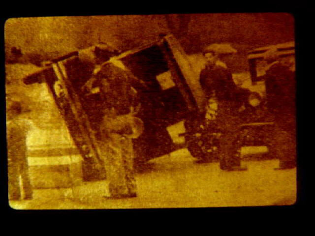 EV 148 1934 September Overturned autos on Social Street during Textile Strike of 1934. Close view.