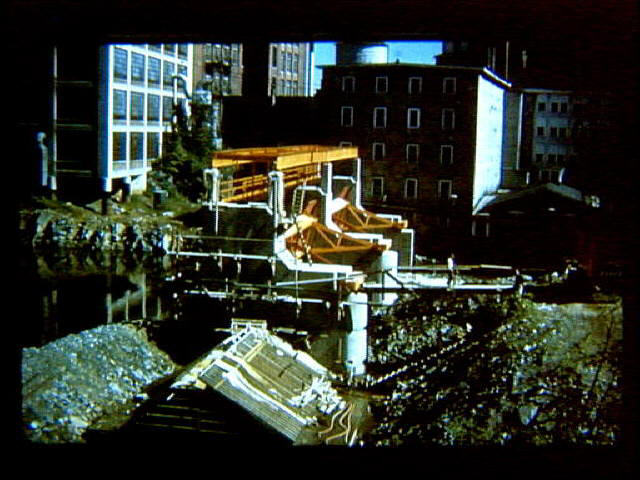 Flood of 1955 showing flood control work in area of Woonsocket Falls. Partially completed removable dam.