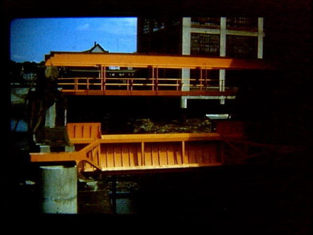 Flood of 1955 showing flood control work in area of Woonsocket Falls. View from Globe Bridge showing one section