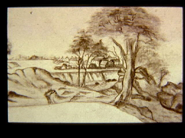 WF 5 1920 Sketch of Woonsocket Falls circa 1850 taken from Marie-Louise Bonier's "Debuts de la colonie Franco-Americaine dans Woonsocket, R.I." published in 1920.