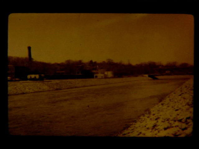 BR 16 1960�s Blackstone River with Cold Spring Park on right and Singleton Street Bridge in background. View of rip rap which lined the banks of the river after flood control project of the 1950's.