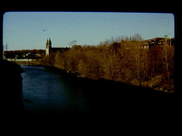 Blackstone River looking upriver from the Hamlet Avenue bridge. Background shows Kendrick Avenue footbridge