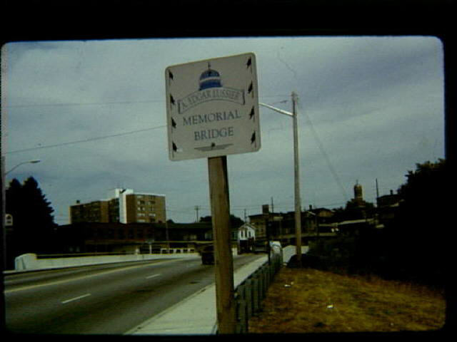 BG 55 1991 July Sign at Bernon Street (Lussier Memorial) Bridge designating the structure as a memorial to the late Mayor Lussier.