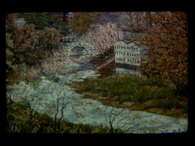 BG 21 1900 (c) Oil painting depicting the Globe Bridge as viewed from the Front Street area. Painting is from the collection of H. Julian Mitchell. On the right is the former Woonsocket Rubber/Falls Yarn building (Woonsocket Visitors' Center site). View is from the early 1900's.