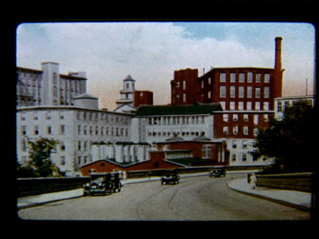 Globe bridge looking down hill showing cluster of mills at Woonsocket Falls.