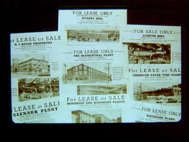 TM 275 1950's Advertisements showing various Woonsocket textile mills for lease, sale or rent.
