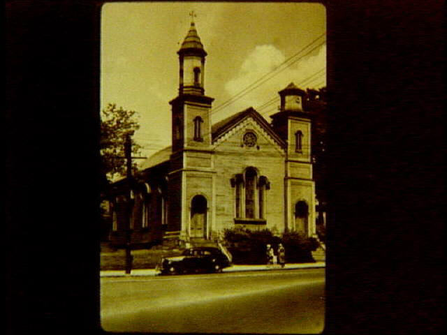 Saint James Episcopal church. Front angled view. Church was reconstructed in 1938. Photo taken previous to reconstruction.