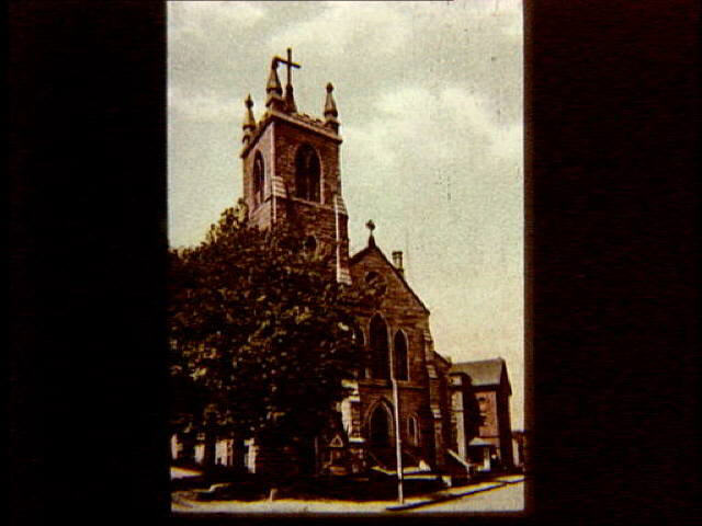 St. Charles Borromeo Church at Daniels and North Main Streets. Angled view with school in background on right.