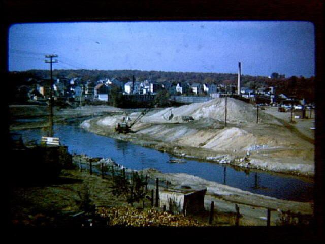 Flood of 1955 aftermath showing flood control work; view of "The Island" area in Fairmount. Temporary U.S. Army