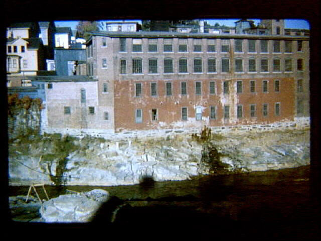 Flood of 1955 aftermath showing flood control work along banks of the Blackstone River. Glenark Knitting Mill from