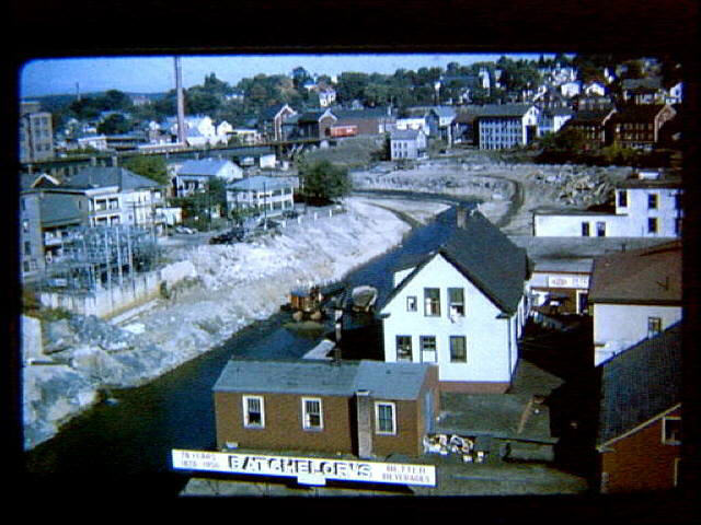FL 123 c. 1958 Flood of 1955 aftermath showing flood control work; view of area of Blackstone River near Batchelor's Bottling Works. River Street and Bandwagon railroad bridge in background. View from American Worsted Company tower.