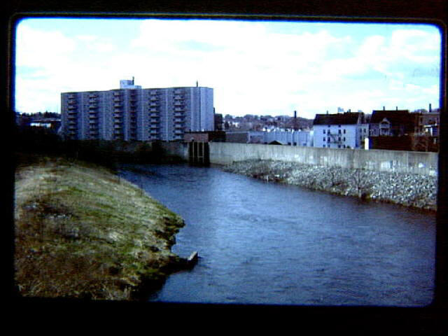 The Mill River meeting the Blackstone River behind Kennedy Manor. River flows under Social and Clinton Streets.
