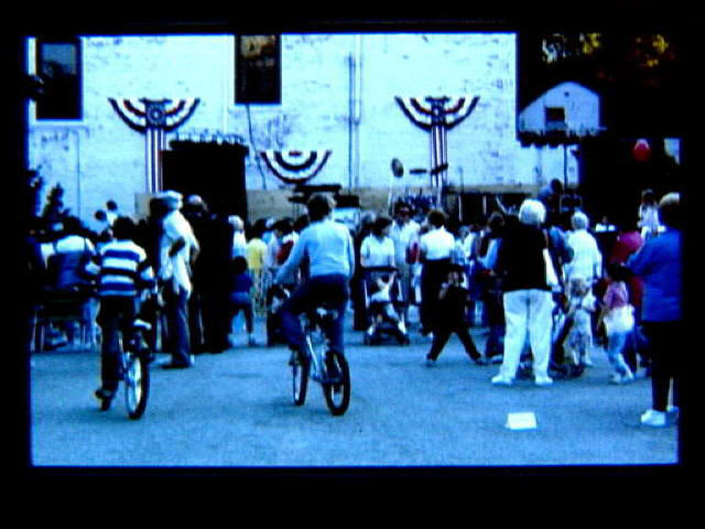 EV 225 1988 Woonsocket Centennial Celebration in 1988. Main Street Block Party during the centennial year. Crowd and bicyclists near Mullen parking lot.