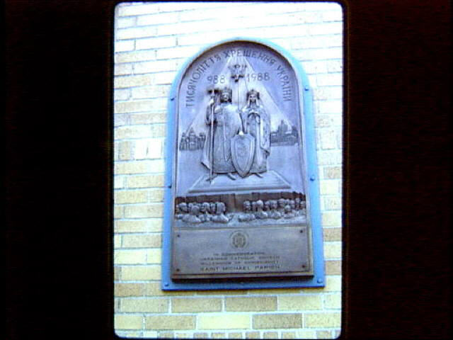 CH 184 1989 St. Michael's Ukrainian Catholic Church on Blackstone Street. Marker affixed to the building commemorating the sect's 1,000th anniversary of Christianity.