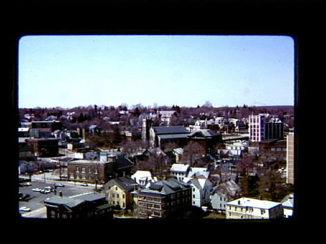 Aerial view of North End showing St. Charles School and Church. Taken from roof of Marquette Credit Union.