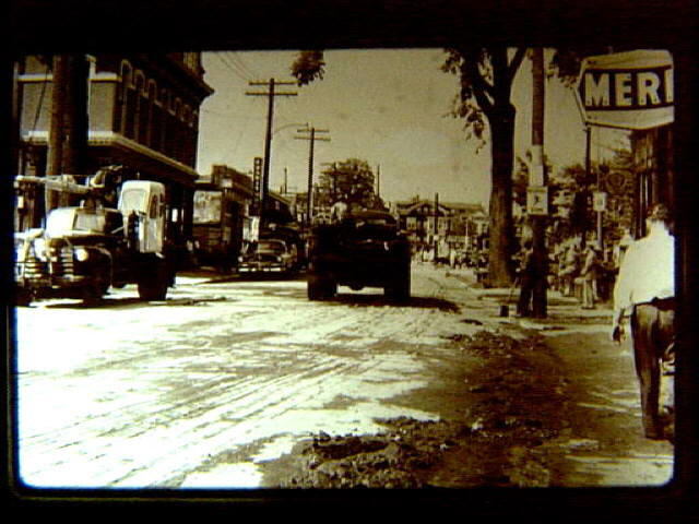 Flood of 1955 looking up Social Street from Merit gas station showing clean up activities in flood's aftermath.