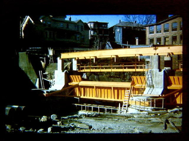 Flood of 1955 aftermath showing flood control work; view of nearly completed Woonsocket Falls dam from Globe