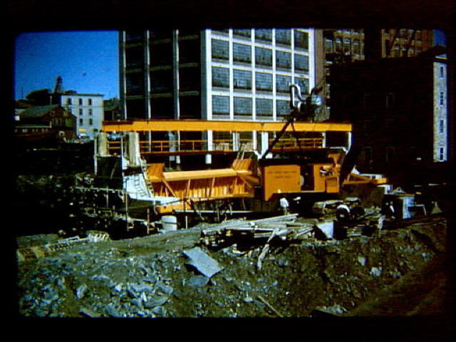 partially constructed flood gate. Crane in foreground; mills at Market Square in background.