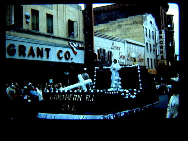 EV 61 1958 Mardi Gras parade showing Northern RI CYO float on Main Street.