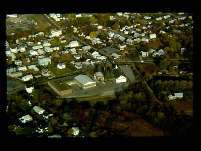 Aerial view showing Mendon Road in vicinity of St. Joseph Church.