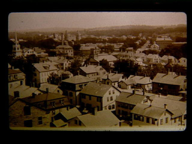 AV 109 1890 August Aerial view of Main Street from the old Baptist Church with Social Mill in background and Nourse Mill and Clinton Street. Methodist church in foreground.