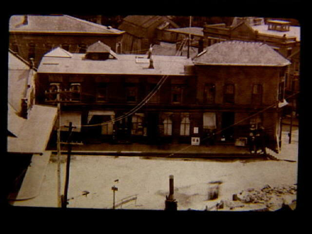 View of rear of Edwards Block from Baptist church at High and Main Streets.