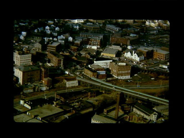 Aerial view of downtown Woonsocket focusing on Depot Square area.