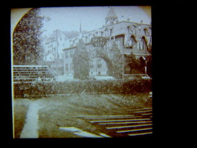 CH 122 c. 1900 Saint Ann's church on Gaulin Avenue. Photo shows outdoor view of church and school with decorated arch.