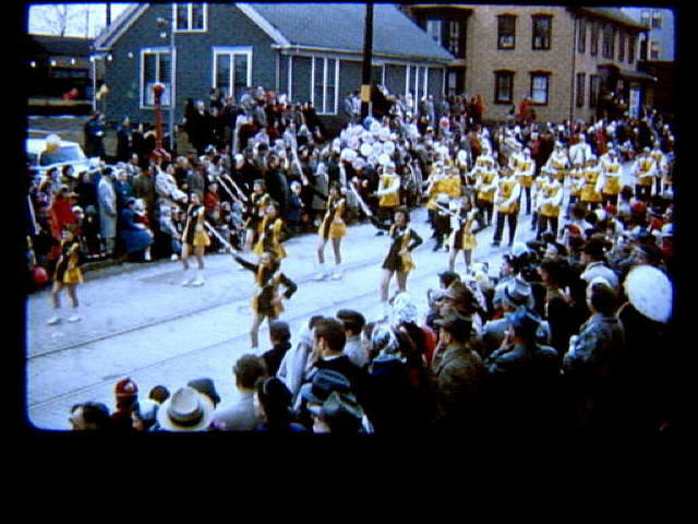 EV 110 c. 1955 Mardi Gras parade on South Main Street. Drum and bugle corps.