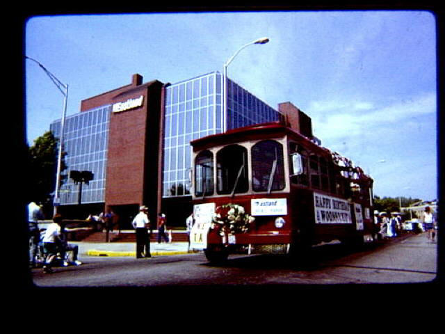 Woonsocket Centennial Celebration in 1988. Parade in June 1988. Trolley car sponsored by Eastland Bank.