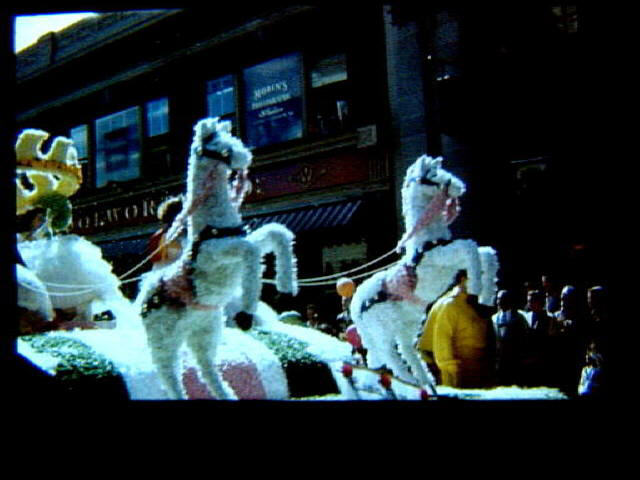 EV 62 1958 Mardi Gras parade showing fanciful sculptures of horses leading the queen's float.