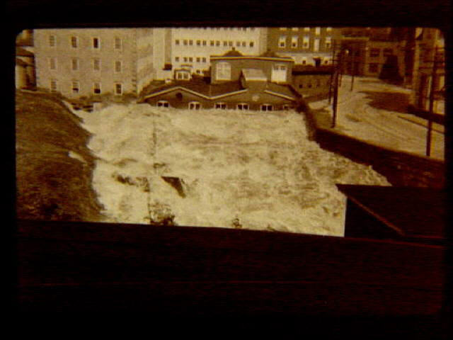FL 76 1955 August Flood of 1955 showing water pouring over the Globe Bridge. Photo taken from Glenark Street. Waters flooding the mills at Woonsocket Falls.