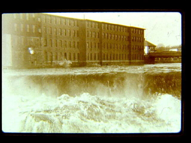 Floodwaters pouring over the old Woonsocket Falls dam. Glenark Knitting Mill in background.