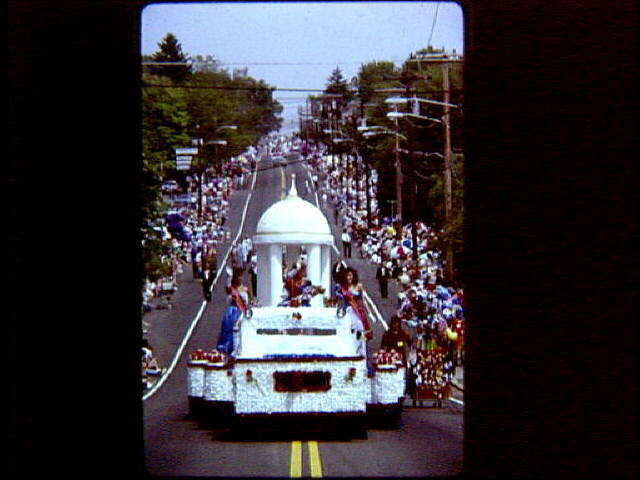 EV 230 1988 Woonsocket Centennial Celebration in 1988. Parade in June 1988. Centennial float with Centennial Queen (Michelle Forget) and her court.