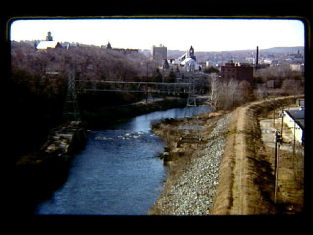 BR 56 1988 December Blackstone River looking north from the roof of Kennedy Manor on Clinton Street. View of flood control embankment.
