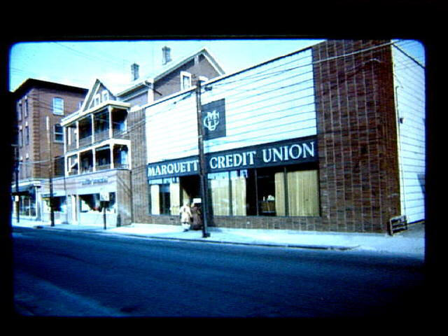 SO 145 1972 March View of Marquette Credit Union on Cumberland Street facing Clinton Street. Gaulin Travel Agency adjacent to it.
