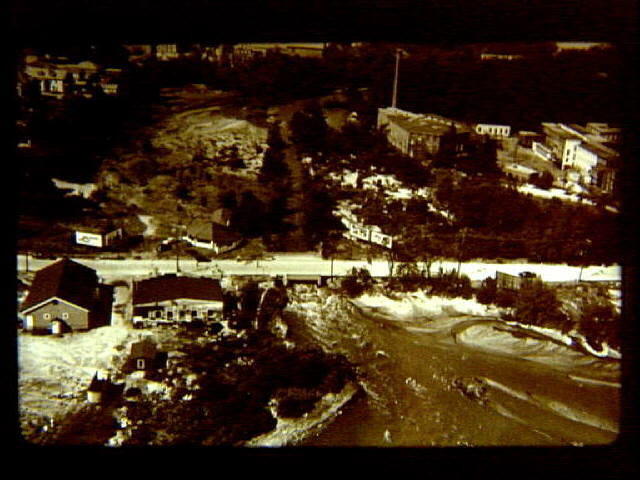 Flood of 1955 showing Mill River going under East School Street bridge into Social Pond.