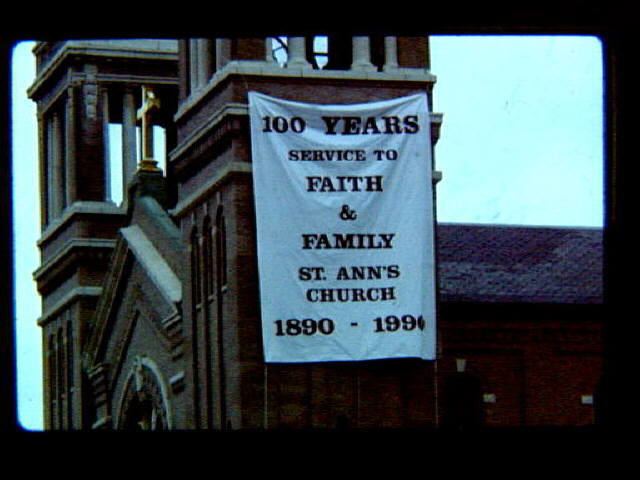 CH 133 1990 October Saint Ann's church on Cumberland Street. View showing the centennial banner hanging from the towers.