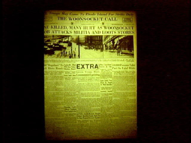 Woonsocket Call newspaper headline on textile strike of 1934.