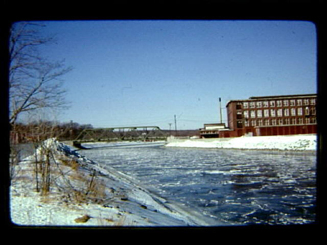 Blackstone River looking north toward Singleton Street Bridge from River Street side of river. River is frozen.