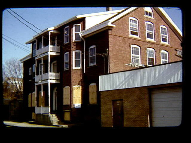BU 121 1987 April Tenement house on River Street. Formerly St. Michael's Catholic school belonging to St. Charles parish to serve parishioners who lived a distance from St. Charles school. Named after pastor Rev. Michael McCabe.