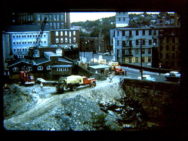 Flood of 1955 showing flood control work in area of Woonsocket Falls. Concrete mixing trucks delivering concrete for