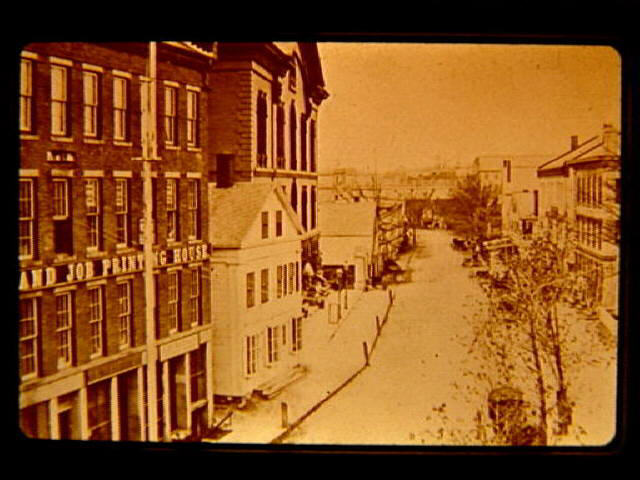 View of Main Street looking towards Market Square. Patriot Block and Harris Hall in foreground. Street is unpaved. In