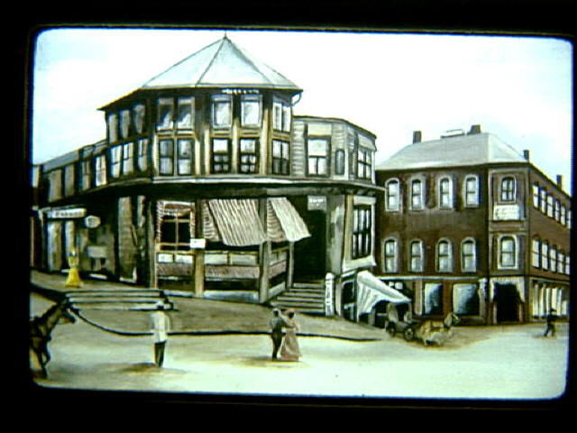 Painting showing Depot Square area of Main Street c. 1915. Edwards Block and Hope Building. Pedestrians and