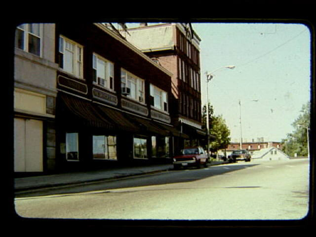 Main Street ground level shot looking towards Monument Square showing Linton Block and adjacent office building.