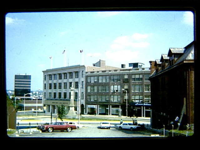 Main Street Monument Square area looking towards the Municipal parking lot showing the monument, Stadium