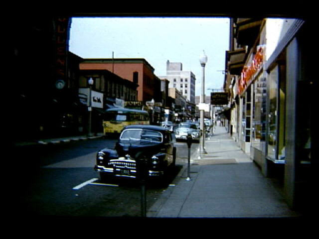 MS149 1954 Main Street looking towards Depot Square from Mullen's Furniture and the Woonsocket Call.